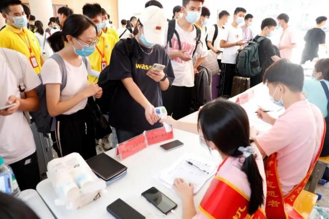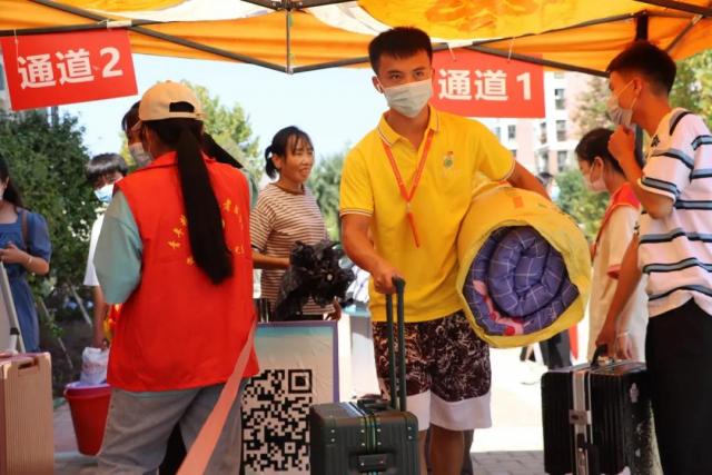 在迎新过程中,学院防疫工作并未松懈,健康码检查 测量体温 配发口罩,查14天行程码 核酸检测证明,志愿者们分工明确,疫情未止 防疫不息。