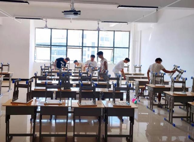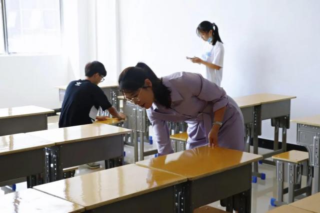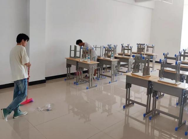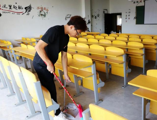 当天上午,我系学生干部和助理辅导员一共30人,在系部老师罗晓雯、陈高超、张信歌的带领下开始了万众一“新”的清扫。大家分工明确,各显其能,纷纷手持扫帚、抹布等清洁工具,有序地进行卫生大扫除。大家干劲十足,不怕脏、不怕累,相互配合,有的蹲下身子清理地板上的污渍;有的用笤帚扫除杂物;有的拿抹布擦洗桌子、凳子、黑板等,撕去墙上的海报,争取做到不留死角、不留盲区。经过大家一上午齐心协力的“奋战”,新生教室面貌焕然一新,处处整洁,片片清新。