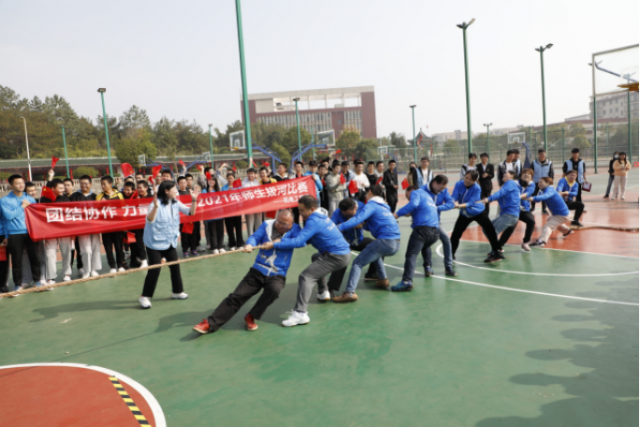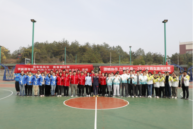 同时,宋小兵叮嘱同学们面对就业问题,要实事求是,坚持脚踏实地,不好高骛远,在新时代的浪潮中,要勇做新时代的弄潮儿,积极投身于基层,贡献自己的青春力量,把握机会,努力学习。谈笑间,宋小兵还不忘提醒同学们爱惜粮食,践行光盘行动。“谁知盘中餐,粒粒皆辛苦。”说完,宋小兵以身作则,将饭菜吃光。 百年恰风华青春新征程 2021年11月19日下午12:30,宋小兵来到篮球场,与机电工程系全体教师、辅导员和学生代表进行“拔河比赛”、“袋鼠运南瓜”、“摸石过河”、“绑腿竞走”四个集体比赛项目。
