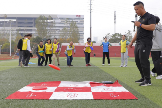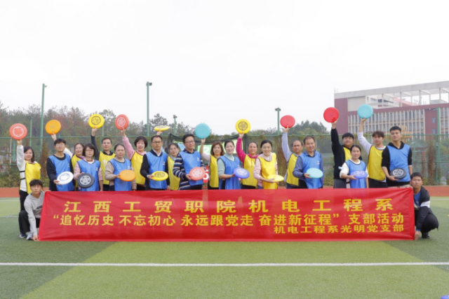 薪火相传二十大诵读红色颂党恩 随后,支部党员在学院金丰凌云处,共同朗诵《学习党的二十大,奋进新征程》。热情讴歌中国共产党领导中国革命建设取得的丰功伟绩,增强民族自信心和自豪感,落实立德树人根本任务,更加坚定了党员教师们了解党、热爱党、心向党、跟党走的情怀。 我心向党运动飞扬 活动最后,在田径场内开展飞盘运动:通过飞盘投篮、飞盘九宫格、飞盘保龄球等,让党员教师们体会到团队协作的重要性,帮助党员教师学会相互尊重欣赏,建立起良好的信任与沟通,进一步增强团队的凝聚力,锻炼支部党员为了共同的目标相互配合,以更好、更足的干劲共同应对挑战。