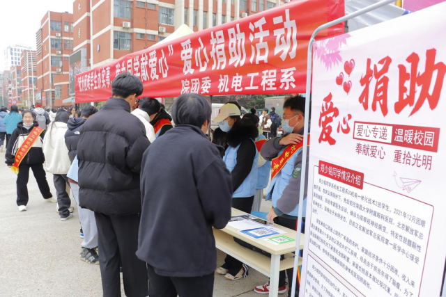 为深入学习宣传贯彻党的二十大精神,深入推进“我为群众办实事”实践活动,切实帮助困难学生,做好困难学生帮扶救助工作,根据《关于基层党组织认真学习宣传贯彻党的二十大精神的方案》(赣工贸党〔2022〕62号),机电工程系光明党支部聚焦学生“急难愁盼”问题,于12月7日在食堂门口举办“我为困难学生办实事”之奉献爱心主题活动。将学生呼声作为第一信号,将学生需求作为第一导向,将学生满意作为第一标尺,多措并举、精准发力,把实事办得“有亮度”“有温度”“有力度”。