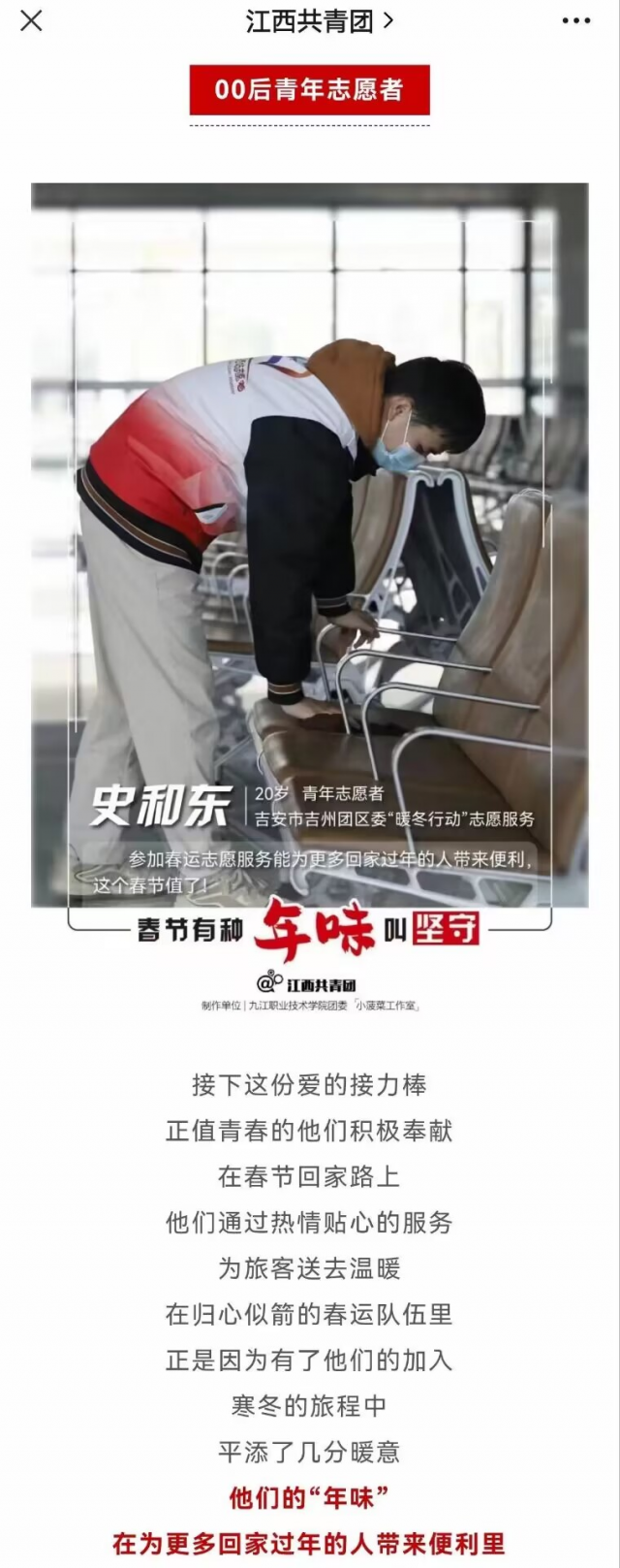 在学校积极奉献、有所作为的同时,史和东同样将家乡的建设放在了心上,并为家乡的建设贡献出自己的青春力量。在假期回到家乡时,他在报名参加学校组织的回乡调研的同时,他还积极与当地团委联系,亮出身份,积极参加大学生“返家乡”社会实践活动,事迹被江西共青团报道。在短短的假期里,却可以在“童心港湾”、“河小青”、“暖冬行动”等志愿活动中都能够寻觅到他的青春身影。