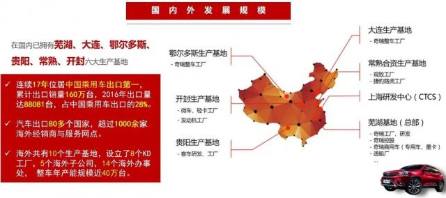 奇瑞汽车股份有限公司(国企)成立于1997年1月8日,历时20余年的创新发展,现已成为国内最大的集汽车整车、动力总成和关键零部件的研发、试制、生产和销售为一体的自主品牌汽车制造企业,以及中国最大的乘用车出口企业。