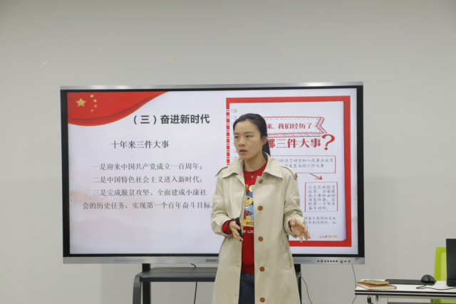 课程伊始,系副主任晏慧敏带领在场青年重温了党的二十大的主题、十年来的三件大事。深刻阐述了“旗帜”的重要内涵,旗帜就是标志,我们要高举中国特色社会主义旗帜,全面贯彻新时代中国特色社会主义思想,弘扬伟大建党精神。