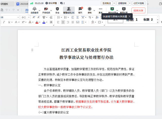 分别由教研室主任李洪娟领学《江西工业贸易职业技术学院教学事故认定与处理暂行办法》,由韦娜组织学习了《江西工业贸易职业技术学院课堂教学管理规定(修订)》,由胡晓莉组织学习了《江西工业贸易职业技术学院教师师德师风考核办法(修订)》。