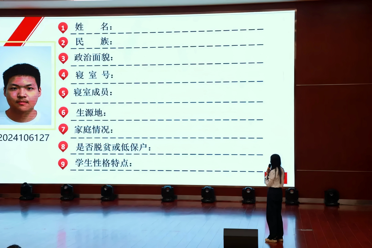 本次比赛重点考察参赛选手对班级每一名学生基本情况的掌握程度,主要包括姓名、民族、政治面貌、寝室号、寝室成员、生源地、家庭情况、是否脱贫或低保户、学生性格特点等内容。大赛的具体分为两个环节进行:一是随机抽取5名学生的照片与非本班学生照片混合于一个页面,参赛选手须依次从众多照片中挑出自己的学生;二是依次回答挑选出的5名学生的8项基本信息。