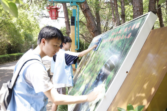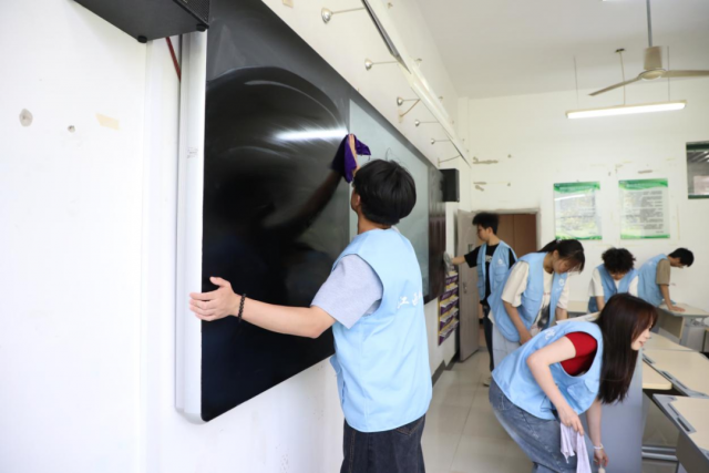 营造洁净教室护航学习之旅 团校成员们来到厚泽楼,分组对各个教室进行全面的清洁工作。他们不放过任何一个角落,擦拭桌椅、黑板、门窗,清扫地面,倾倒垃圾,每一个动作都饱含着对师生的关怀。同时,认真整理讲台教学用具,如粉笔、教具等,并将移动的桌椅归位,确保教学区域整洁明亮,为师生们打造出一个舒适惬意的学习环境。