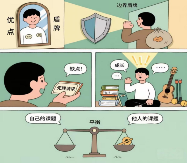 三、如何拥有被讨厌的勇气? 1.接纳真实的自己:每个人都有优点和不足,学会正视自己的不完美。不要因为害怕被讨厌而隐藏真实的自己,只有接纳全部的自己,才能建立起真正的自信。 2.建立清晰的边界:明确自己的原则和底线,学会对不合理的要求说“不”。当你尊重自己的边界时,他人也会逐渐尊重你。 3.专注自我成长:把注意力从他人的评价上转移到自身成长中。当你不断提升自己,内心变得强大,就不会轻易被他人的看法左右。 4. 实践课题分离:时刻提醒自己,区分哪些是自己的课题,哪些是他人的课题。不要为了他人的课题过度消耗自己,也不要让他人随意干涉自己的课题。