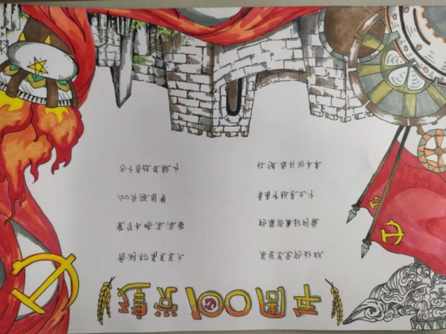 100年沧海桑田,100年风风雨雨 100年曲折探索,100年腾飞跨越 100年同舟共济,100年众志成城 我系的同学们用画笔描绘党的奋斗历程,诉说对党强烈的爱与美好的祝福,谨以中华儿女赤字之情,恭祝建党100华诞! 100周年,建党的100周年——红色文化的建设、传承红色的基因,坚定文化的自信、提高社会文明水平的内在要求。在这个日新月异的现代化社会中,吃苦耐劳、坚持不懈始终是我们奋斗的底色。