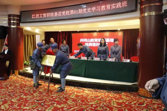 李乐德向机电学子们讲述了井冈山的革命历史,希望大家通过这次井冈山活动认真学习井冈山的精神,并把井冈山精神运用到实际学习生活中去,做到“不忘初心,牢记使命”。学习井冈山精神要与加强党性修养相结合,与弘扬党的优良传统相结合,与自觉遵守党的纪律相结合; 万玉青与李乐德进行揭牌仪式