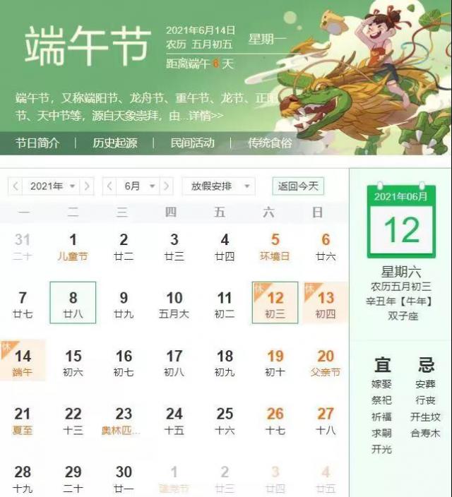 根据学校安排,放假时间:6月12日—6月14日(共放假3天)。端午的即将到来,不知道你们,现在怀着什么样的心情?是不是和小编一样,对接下来的端午节满怀期待呢?下面跟着小编一起,了解一下端午节的习俗吧!