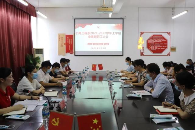 为积极部署2021-2022学年度上学期工作,及时总结工作中的经验和不足,协调安排开学前各项准备工作,大力促进机电系教学口和学工口工作的高效融合,提升新学期的工作思路,确保新学期各项开学工作平稳、有序、高效地开展。2021年9月3日电工程系在厚泽楼324光明党支部召开了2021-2022学年度上学期教职工大会,学院党委委员·副院长宋小兵、学院党委委员·副院长胡晖、学院教务处曾聪处长、学院学工处李尊华处长、学院组织部雷婧江副部长等一行领导以及机电工程系35名教师教职工参加此次会议。大会由机电工程系党支部书记、主任马龙凤主持。