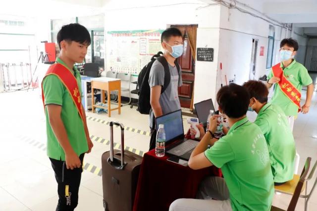 处理好了入学的各项事宜,跟着学长学姐来到了宿舍。在这里,志愿者也早早等待着新生,为新生选定宿舍拿取宿舍钥匙、空调遥控器和个人防疫用品后进入宿舍。