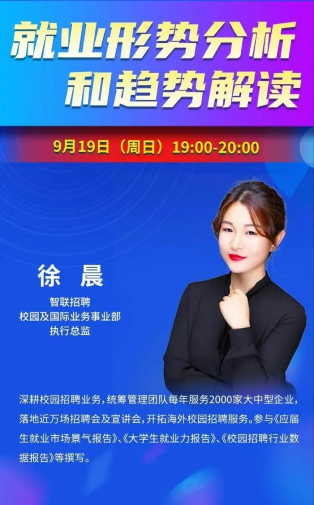 直播课在学习强国、人民视频、央视频、求是圆点、中国教育电视台、凤凰教育等十多家媒体平台同步开播。课程由智联招聘校园及国际业务事业部执行总监徐晨为大家讲解,讲座就促进高校毕业生就业创业政策进行深入解读,全面分析明年就业形势,对同学们如何提升自身就业能力,如何提升学习效率进行详细指导。老师希望学生要基于自身条件选择适合自身的行业和岗位,同时还要勇于深度开发,快速提升自身效率。