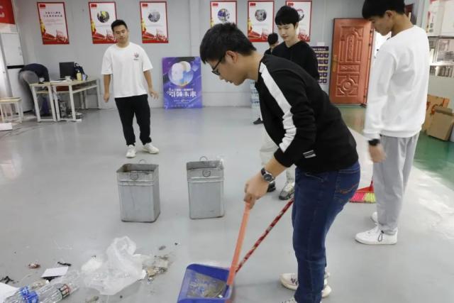 马主任对全体工作人员作了动员讲话,因疫情防控要求,大家要始终保持密切沟通,高度关注疫情形势变化,及时做好防控工作,适时推动赛前工作进度,并从场地合理布置、安全隐患排查预防等方面进行了周密布置,以更高标准、更高质量的筹备各项工作。 机电暖心行动 不负每一份热爱 在马主任情真意切的动员讲话后,机电系老师和学生志愿者一同参与赛场布置整理,师生动力十足,以干净、整洁、有序的标准对各个场所进行全方面无死角的打扫和整理。志愿者们携带扫帚、拖把、抹布等清洁工具,对比赛场地不同区域的地面、墙面、窗台、楼梯、扶手进行全面的打扫、清洁、布置。