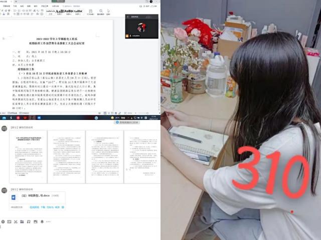 之后马龙凤主任进一步明确机电工程系疫情防控工作,作出六点要求:一、全校师生职工凡是10月11日以后有过上饶及九江等疫情风险地区的旅居史要立即上报。二、做好个人疫情防控,在校园及外出佩戴口罩,勤洗手、勤通风,做好每日健康监测,有异常等情况及时反馈,不隐瞒。三、注意用餐安全,保持等候距离,尽量打包带回宿舍食用,不堂食;全院暂停各类聚集性的活动,线上教学期间暂停晚自习。四、认真做好疫情防控的相关宣传教育工作,没有特殊情况不前往人流密集的场所,不聚集。五、做好相关学生核酸检测、隔离学生后勤保障、学生心理疏导、引导学生不信谣、不传谣、不造谣。六、全体师生务必高度重视疫情防控工作,认真落实院防控办其他指令,及时做好相关数据统计工作。
