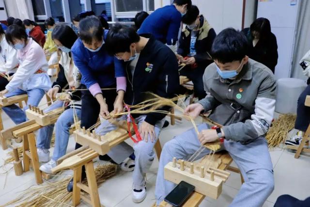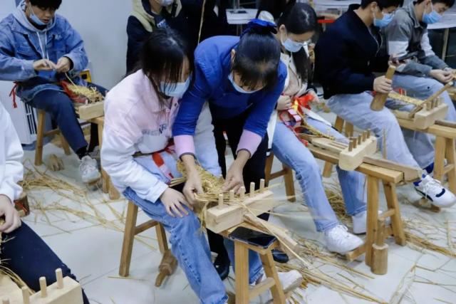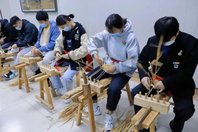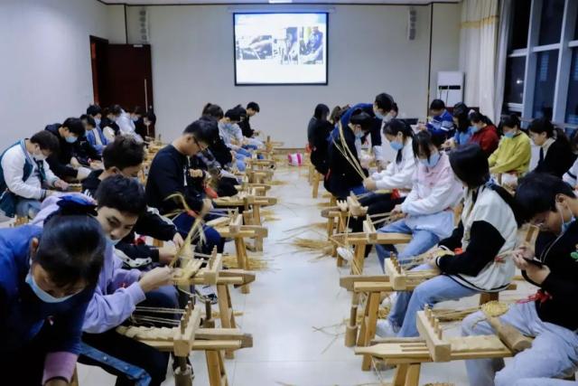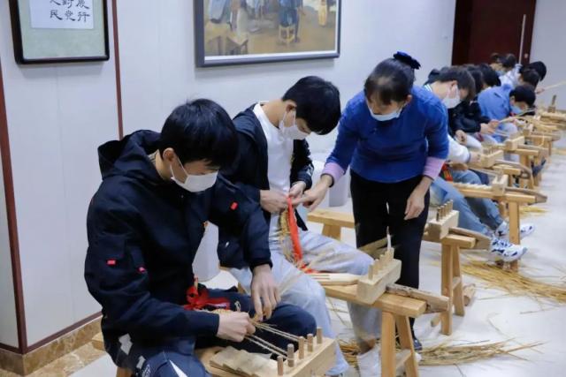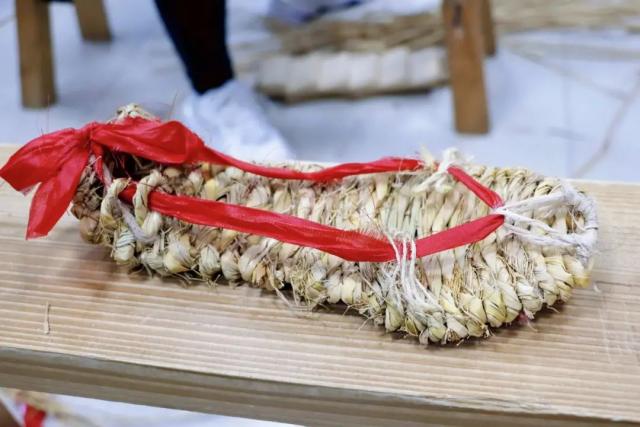 之后、学员们便开始上一堂编草鞋体验课,非遗传承手工老师将稻秆绳的一头系在木耙齿上固定好两个圈,一头系在腰间,细搓麻绳后,然后将麻绳挽向草鞋靶的空隙内,按照编织顺序逐次编织,编到三个手掌的长度,再将草鞋拉紧、压实,取一条麻绳,穿过草鞋鼻头。学员们认真学习指导老师的编草鞋步骤,挽圈、编织、丈量、压实……。“脚穿草鞋跟党走,红军草鞋作为一个历史符号,是长征精神的化身,是当年千万红军战士艰苦跋涉、浴血奋战的一个历史见证和象征。 古色、红色、绿色 茅坪镇马源村