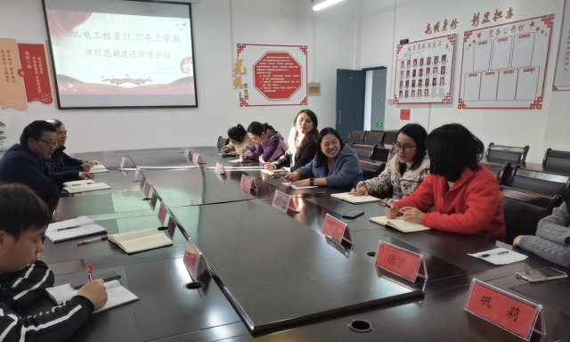 为贯彻落实全国高校思想政治工作会议精神,落实立德树人的根本任务,稳步推进专业课程教育教学改革,充分发挥专教师育人职责,专业课堂的育人功能。11月30日下午,机电工程系在厚泽楼324光明党支部召开了由思政部教师宗彦、殷雨晴和王多老师参与的专业课程思政工作推进会。