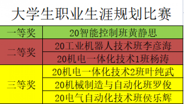 让我们一起来恭喜他们吧! 此次比赛进一步激发了学生对职业生涯规划的热情,推动了机电工程系职业生涯规划教育的普及和提升,使学生个人对未来职业走向和职业发展有更清晰的认识,同时提高学生的综合素质、避免学习的盲目和被动,帮助同学们对自己的职业目标和实施策略更加明了。本次职业生涯规划大赛已经落下帷幕,但选手们的青春之歌仍在继续。相信每一位机电学子都能不负热爱,在自己规划的人生道路上以梦为马,一路扬帆!