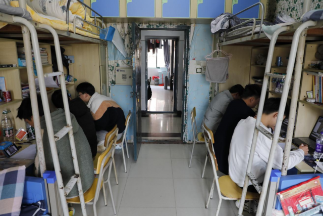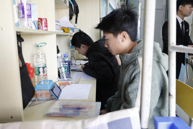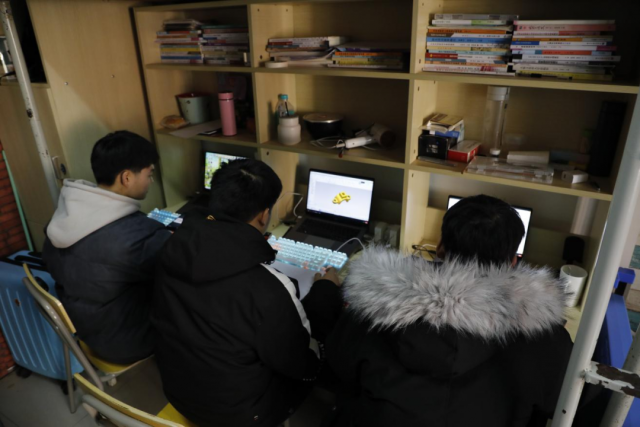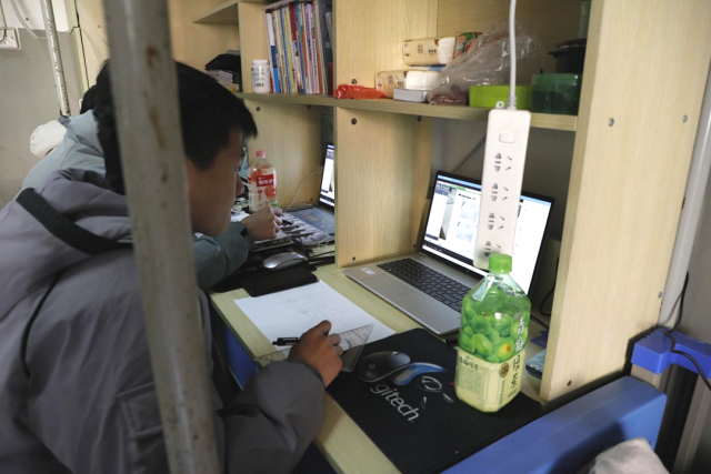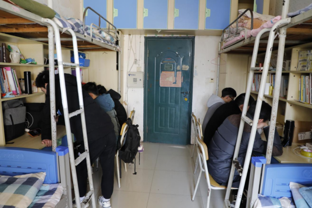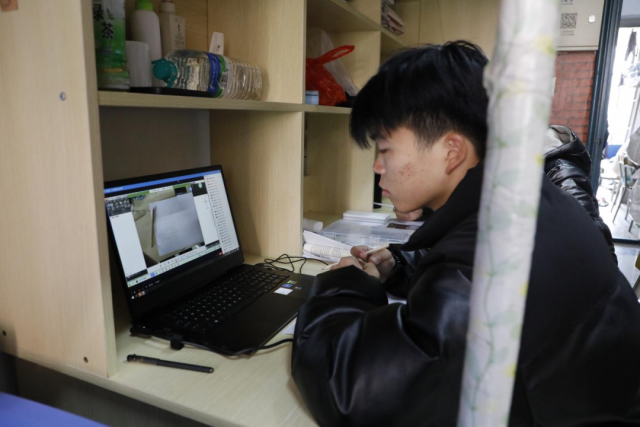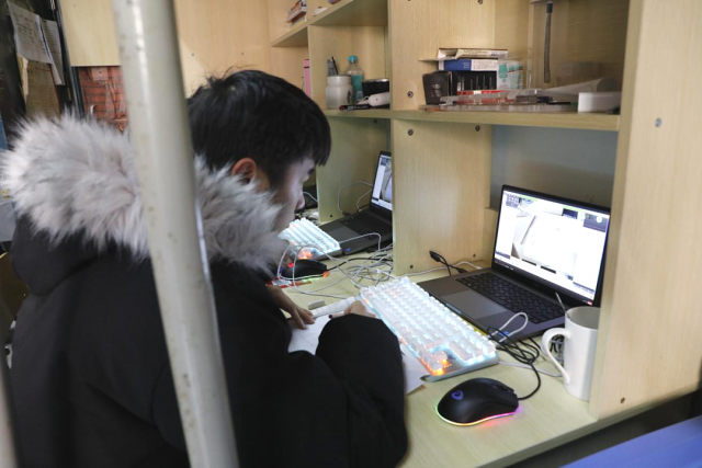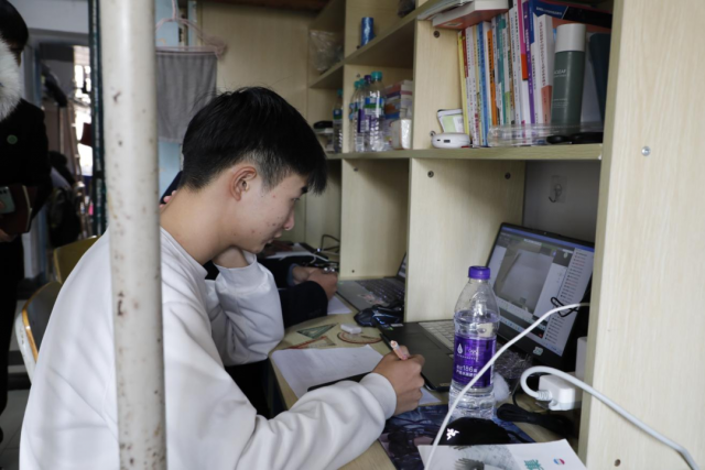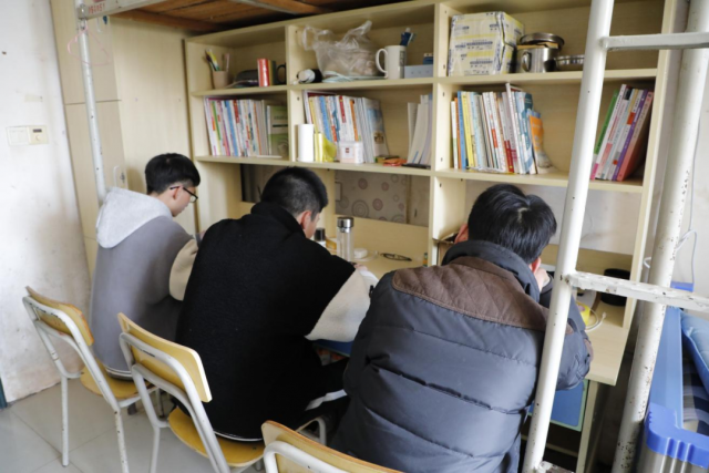 几位舍友做成一排 认真听讲网课 遇到难题,方便讨论 一起解决