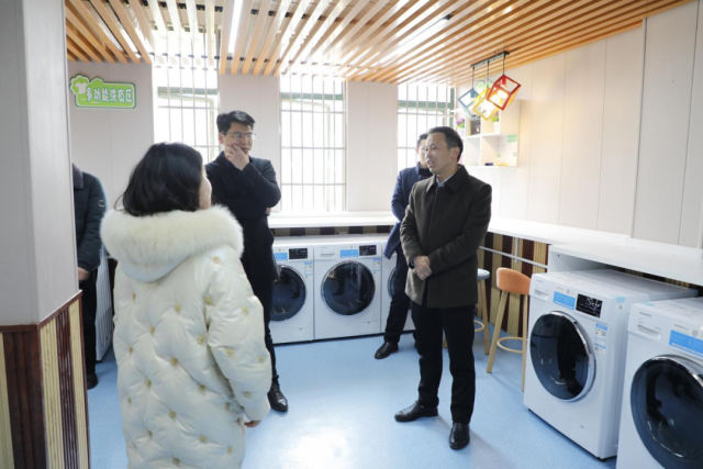 在检查工作开始之前,学院党委委员、副院长刘国红特别关注了学生们的生活区域,新型自助洗衣房。这为同学们的日常生活带来的是前所未有的便捷,通过洗衣APP或微信公众号实现了在线预约、下单、查看洗衣进度、完成提醒、网络支付等服务,实现了——“遥控洗衣”;同时,自助洗衣机还自带了桶自洁和银离子杀菌功能,特别是除菌率99.99%的纳米银离子除菌技术,为学生提供接近无菌的洗涤环境。