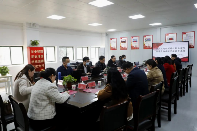 2022年2月28日下午, 台州科技职业学院揭晓教授等一行4人在江西生物科技职院教务处周育辉处长的陪同下来到江西工贸学院机电工程系就教师教学能力竞赛过程中选题背景,校企融合,思政元素如何融入等方面进行深入的交流调研。 会议由学院教务处处长曾聪主持,经济贸易系彭晔主任、2021年教学能力比赛全国一等奖市场营销专业团队成员,机电工程系主任马龙凤,粮油建艺系教研室主任、2021年教学能力比赛全国一等奖粮油专业团队成员曾妮,机电工程系副主任刘耀元,2021年教学能力比赛全国二等奖智能产线联调团队成员全体成员谢晖、韦娜老师及学院教务处教务员卢敏,机电工程系教务员王萍老师一同参加本次座谈会。