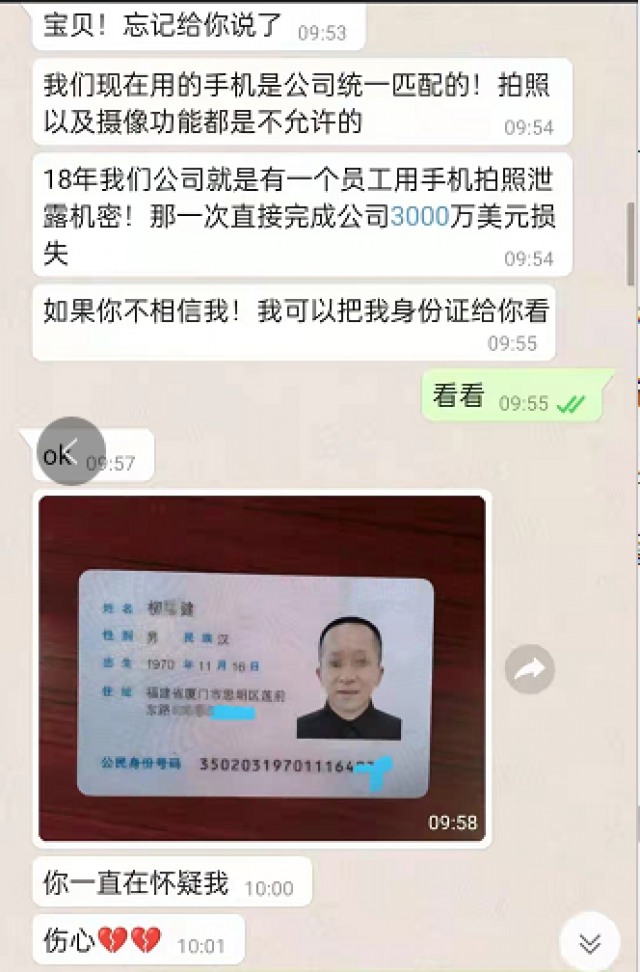 吴女士说:“刚开始聊得时候我还是有点谨慎的,还让他发了身份证来。后来的几天里,他向我透露,他现在是新加坡股票交易市场的分析员,专门负责外汇这块,时不时有点内幕消息。”