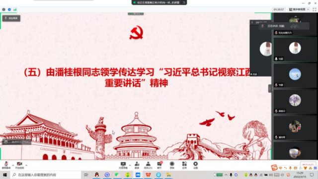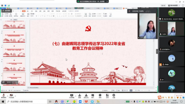 由谢晖传达学习2022年全省教育工作会议精神。坚持以习近平新时代中国特色社会主义思想为指导,全面贯彻落实党的十九大和十九届历次全会精神,深入贯彻落实习近平总书记关于教育的重要论述和视察江西重要讲话精神,总结2021年全省教育工作,分析当前教育工作形势,部署2022年重点任务,加快推进教育强省建设。