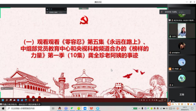 十九届六中全会 会议开始观看《零容忍》第五集《永远在路上》、中组部党员教育中心和央视科教频道合办的《榜样的力量》第一季(10集)龚全珍老阿姨的事迹,学习龚全珍的事业精神,朴素作风和传递正能量。