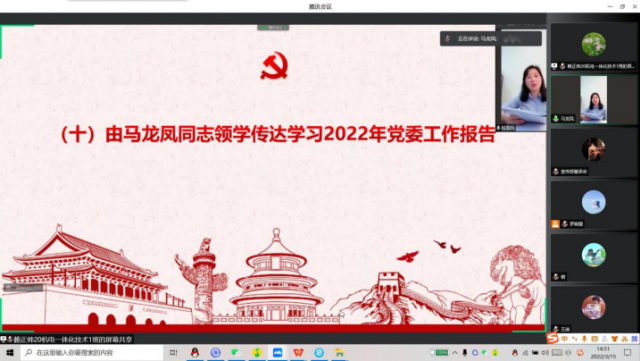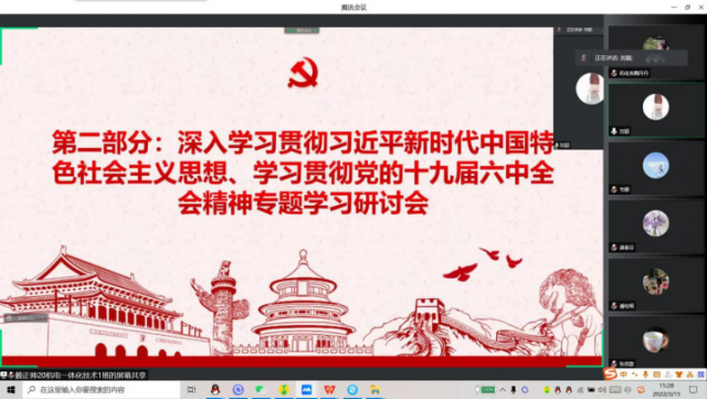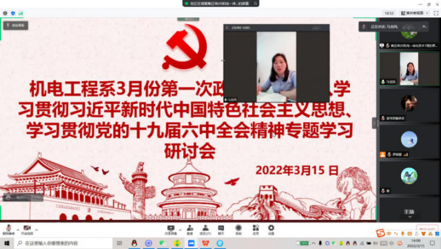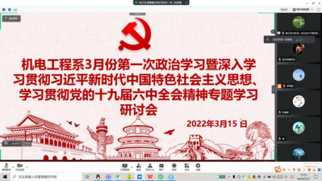 喜迎二十大 争创新业绩 为了深入贯彻习近平新时代中国特色社会主义思想、党的十九届六中全会的精神,并推动系部的稳定发展。机电工程系于2022年3月15 日下午13:40分在腾讯会议召开线上三月份政治学习暨十九届六中全会专题学习研讨会。会议由光明党支部书记、系主任马龙凤主持,机电工程系全体教职工参与此次会议。