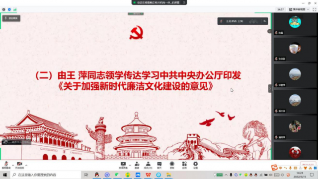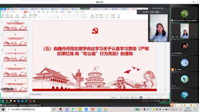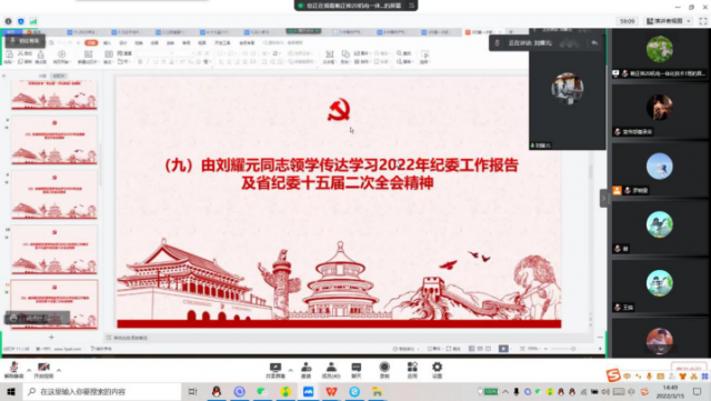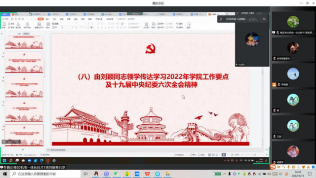 由刘颖传达学习2022年学院工作要点及十九届中央纪委六次全会精神。要更加紧密地团结在以习近平同志为核心的党中央周围,大力弘扬伟大建党精神和自我革命精神,忠诚履职、坚定信心、推动全面从严治党、党风廉政建设和反腐败斗争向纵深发展,坚定不移走中国特色反腐败之路,以实际行动迎接党的二十大胜利召开!