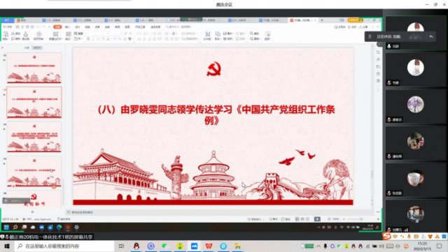 由支委罗晓雯领学《中国共产党组织工作条例》。该《条例》是我们党历史上第一部关于组织工作的统领性、综合性基础主干法规,对于坚持和加强党对组织工作的全面领导、深入贯彻新时代党的组织路线、推进组织工作科学化制度化规范化、全面提高组织工作质量,具有重要意义。