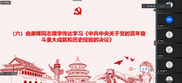 由支委谢晖领学《中共中央关于党的百年奋斗重大成就和历史经验的决议》。号召全党全军全国各族人民勿忘昨天的苦难辉煌,无愧今天的使命担当,不负明天的伟大梦想,以史为鉴、开创未来,埋头苦干、勇毅前行,为实现第二个百年奋斗目标、实现中华民族伟大复兴的中国梦而不懈奋斗。