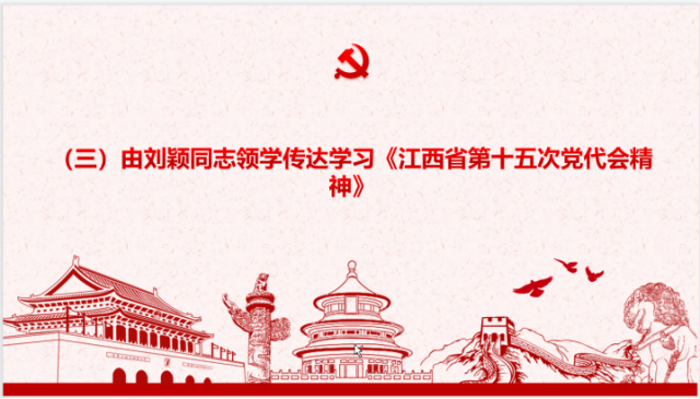 由党支部副书记、副主任刘颖领学《江西省第十五次党代会精神》。我们要以永远在路上的坚定和执着深化全面从严治党,不断提高党的政治领导力、思想引领力、群众组织力、社会号召力,在新征程上展现新气象新作为。