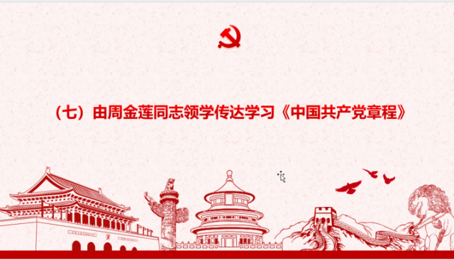 由支委周金莲领学《中国共产党章程》。中国共产党是中国工人阶级的先锋队,同时是中国人民和中华民族的先锋队,是中国特色社会主义事业的领导核心,代表中国先进生产力的发展要求,代表中国先进文化的前进方向,代表中国最广大人民的根本利益。
