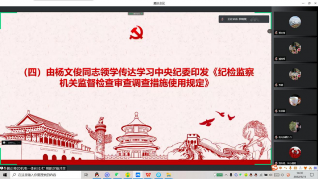 由杨文俊传达学习中央纪委印发《纪检监察机关监督检查审查调查措施使用规定》。贯彻落实党中央关于“纪检监察机关要接受最严格的约束和监督”等要求,总结纪检监察体制改革以来的实践经验,推动实现纪检监察工作规范化、法治化、正规化。