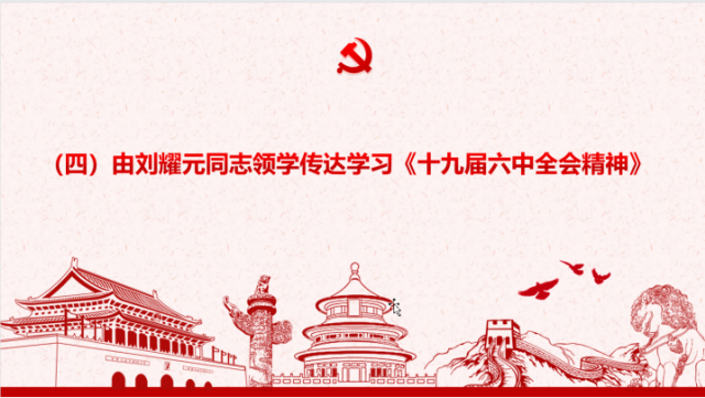 由支委、副主任刘耀元领学《十九届六中全会精神》。党的百年历史新起点、接续推进中华民族伟大复兴的政治宣言书,也是激励全党全国各族人民开启全面建设社会主义现代化国家新征程、向第二个百年奋斗目标进军的时代动员令。