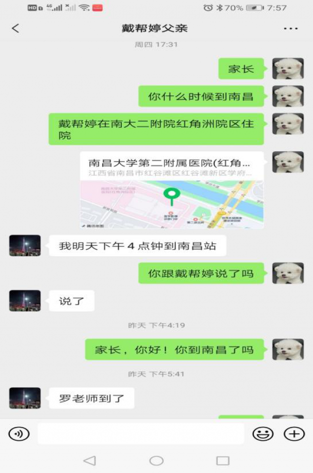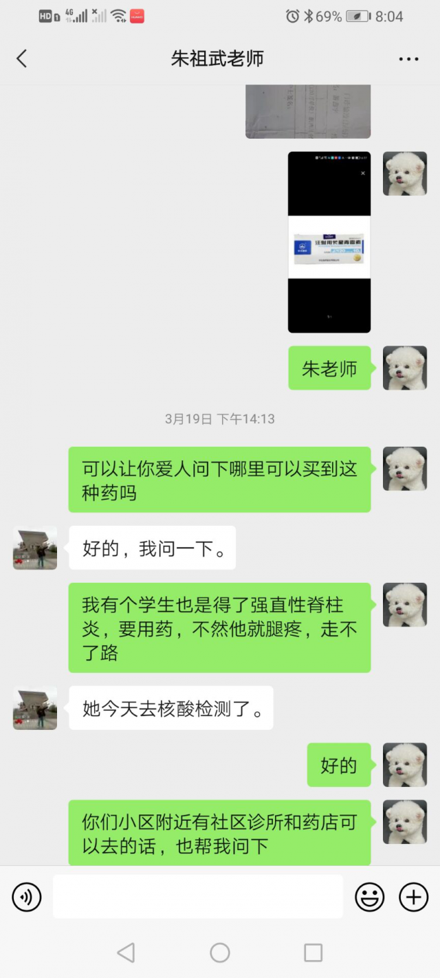 除此之外,还要处理各种突发情况。3月19日下午1点多,21机械制造及自动化班一名患有强制性脊柱炎的学生着急的来求助罗晓雯老师,“晓雯姐,我的药用完了,医务室也没有这种药,怎么样才能买到呀?”,罗晓雯老师非常着急,因为知道这个药对学生非常重要,如果不继续使用,该生的脚逐渐会越来越痛,痛的走不了路。于是罗晓雯老师求助在校外的同事、同城的朋友、同学等,终于通过朋友的介绍帮学生买到了药,学生慌乱紧张的内心也终于得到了安抚。