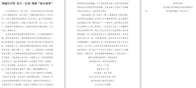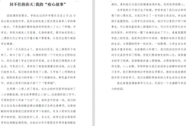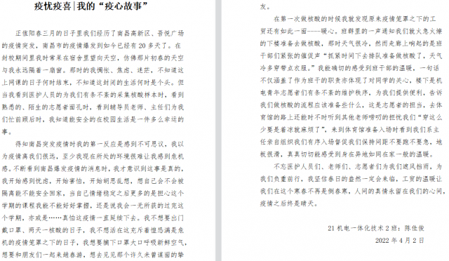 为了帮助同学们缓解疫情期间的心理压力,丰富线上课余生活,机电工程系特此举办了我的“疫”心故事——心理线上征文活动,鼓励同学们用文字记录抗击疫情期间的所思所想,为同学们提供了倾诉的通道,以心与心的联结方式,表达心中对战胜疫情的信心,传递爱与力量!