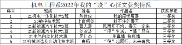 此次活动目的是为同学们提供疫情期间心理压力与感想倾诉通道,提升同学们的抗挫折能力及心理免疫力。同时,让奋战在一线的医护人员为同学们树立榜样激励自我,激发同学们疫情期间中国人齐心协力共渡难关的爱国情怀,展现了机电学子潮气蓬勃、自强不息以及深深的爱国情怀。通过本次疫情心理征文比赛活动,进一步增强了我系同学对疫情心理变化的认识,明确了青年人拼搏奋斗的方向,提高了爱国情感,同时也对我系疫情防控工作起到了积极的促进作用。 |