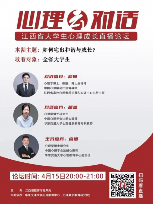 为了贯彻落实习近平总书记关于学生心理健康工作的重要指示批示精神,有针对性地做好疫情背景下大学生人文关怀和心理疏导。机电工程系于4月15日20:00组织学生参与心理云对话。本次心理云对话以《如何宅出和谐与成长》为主题,由江西省高校心理素质拓展和实训中心执行主任舒曼为主持嘉宾,华东交通大学的心理健康教育专职教师胡燕和心理教育中心副主任高旭担当对话嘉宾的形式,给全省大学生带来一场有趣的心理健康对话活动。