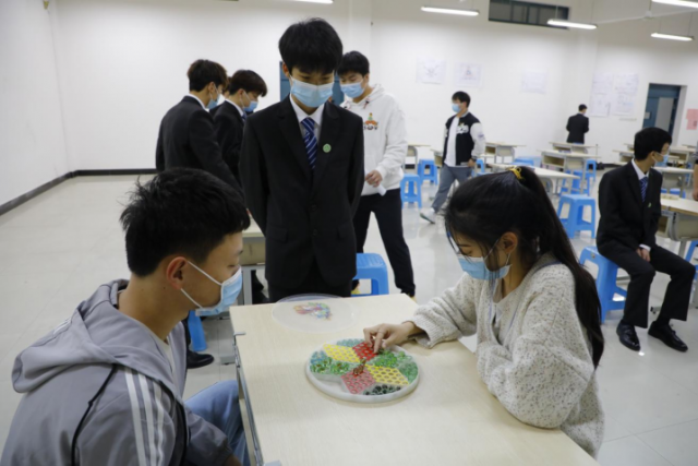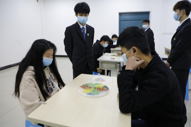 团总支书记张敏玲老师亲临决赛现场,赛场洋溢着一片热闹的景象,参赛选手们镇定自若,举手投足之间都充满了信心。两人你攻我守,每一步都蕴藏杀机。他们展示了不服输的精神,在棋盘上展现了属于自己的机电风采。 跳棋 子居盘角自成军 一跳分明独出群 跳棋的游戏规则是在有直线连接的相邻六个方向进行,如果相邻位置上有任何方的一个棋子,该位置直线方向下一个位置是空的,则可以直接“跳”到该空位上,“跳”的过程中,相同条件满足就可以连续进行,谁最先把正对面的阵地全部占领,哪方就取得胜利。