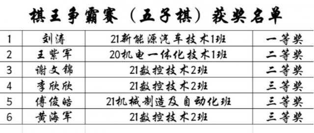 决赛现场层层推进,比赛也越来越激烈,观战的同学们兴致勃勃,下棋的同学也大显身手。展现出了平时少见的风采。身在宿舍,心却仿佛感受到了疫情过后,大家相聚时的其乐融融。病毒可以让我们暂时隔离,但温暖不会被隔离! 经过激烈的角逐,共有以下16位同学获奖,让我们祝贺他们!