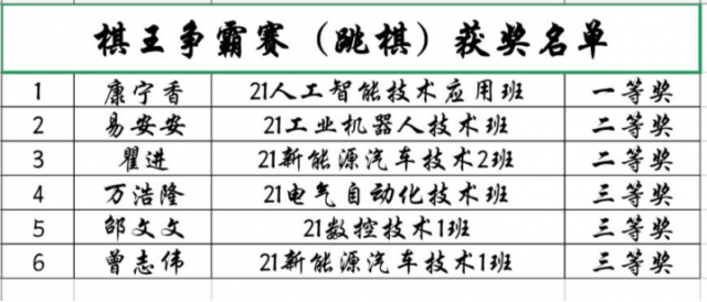 跳棋比赛中,整个过程气氛融洽、欢声阵阵、笑容连连、其乐融融。选手们充分发挥自己的聪明才智、全神贯注、沉着应战、精心布局,在棋盘上展示了棋艺,激发了机电学子的学习热情。 决赛现场层层推进,比赛也越来越激烈,观战的同学们兴致勃勃,下棋的同学也大显身手。展现出了平时少见的风采。身在宿舍,心却仿佛感受到了疫情过后,大家相聚时的其乐融融。病毒可以让我们暂时隔离,但温暖不会被隔离! 经过激烈的角逐,共有以下16位同学获奖,让我们祝贺他们!