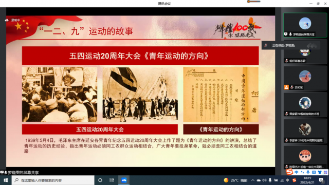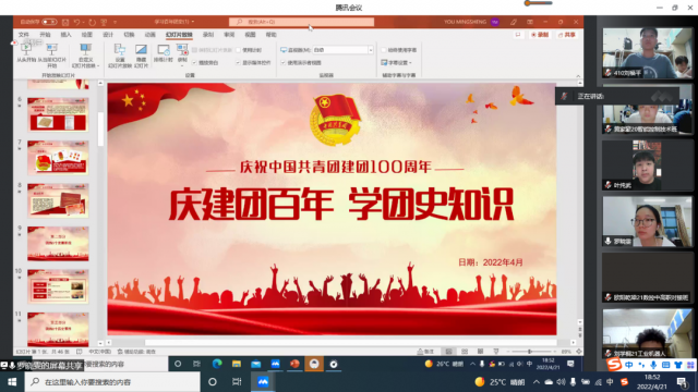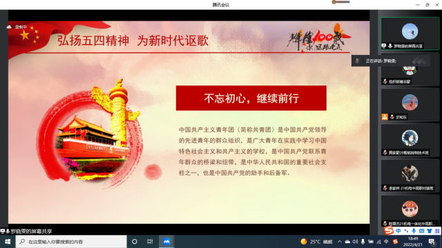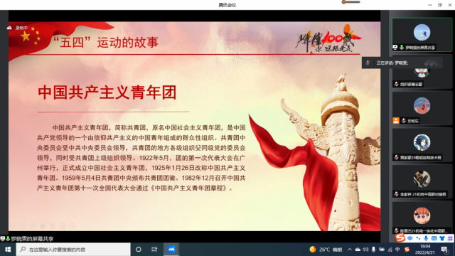 为进一步激励我系业余团校学员继承和弘扬共产主义青年团的优良传统,深入学习科学发展观,增强团员青年社会责任感和历史使命感,提升团组织的凝聚力和战斗力,机电工程系业余团校于2022年4月21日18:00,在腾讯线上会议中展开了一次学百年团史的课程。 机电工程系光明党支部组织委员罗晓雯老师在此次会议中简要阐述了中国共产主义青年团简介、团的3个发展阶段、团的2个历史事件、团的17次会议、弘扬五四精神,为新时代讴歌。