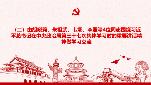 会议第二项环节由胡晓莉,朱祖武,韦娜,李殷等4位同志围绕习近平总书记在中央政治局第三十七次集体学习时的重要讲话精神做学习交流。
