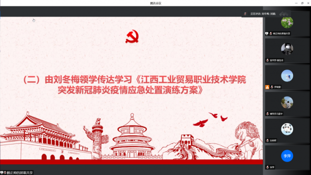 会议第二项议程由刘冬梅传达学习《江西工业贸易职业技术学院突发新冠肺炎疫情应急处置演练方案》。为便于学院师生员工准确掌握校园突发新冠肺炎疫情应急处置流程,快速提升应急处置能力,确保在突发疫情时迅速采取应对措施,科学处置,最大限度控制、减少疫情在校园内传播风险,特制订学院突发新冠肺炎疫情应急处置演练方案。