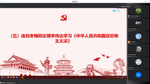 会议第五项议程由刘冬梅传达学习《中华人民共和国反恐怖主义法》。国家反对一切形式的恐怖主义,依法取缔恐怖活动组织,对任何组织、策划、准备实施、实施恐怖活动,宣扬恐怖主义,煽动实施恐怖活动,组织、领导、参加恐怖活动组织,为恐怖活动提供帮助的,依法追究法律责任。