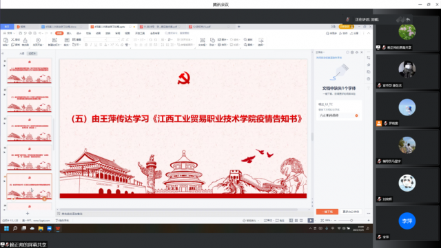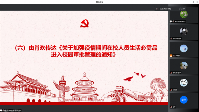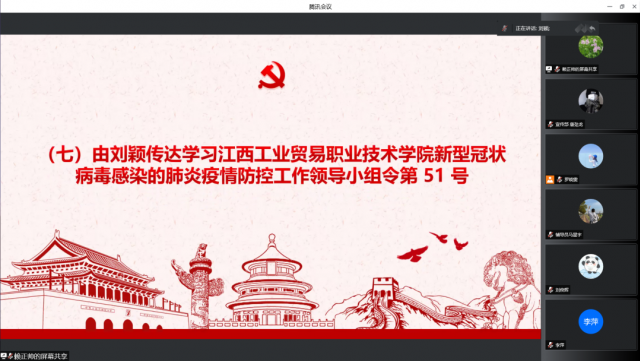 会议第七项议程由刘颖传达江西工业贸易职业技术学院新型冠状病毒感染的肺炎疫情防控工作领导小组令第51号。进一步从严从紧、从快从速抓好学院疫情防控工作,确保守住学院防控底线。