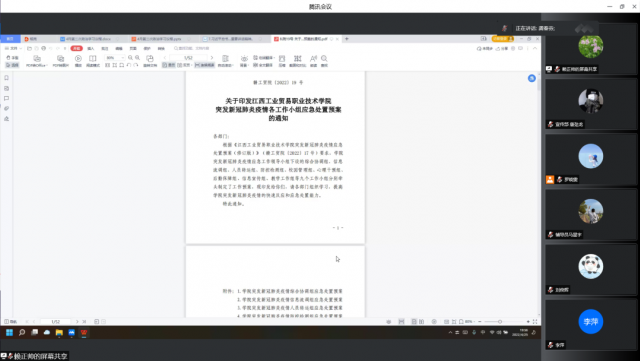 会议第一项议程由龚春芬传达学习《关于印发江西工业贸易职业技术学院突发新冠肺炎疫情各工作小组应急处置预案的通知》。学院突发新冠肺炎疫情应急工作领导小组下设的综合协调组、信息流调组、人员转运组、防控检测组、校园管理组、心理干预组、后勤保障组、信息宣传组、教学工作组等九个工作小组分别牵头制定了工作预案。
